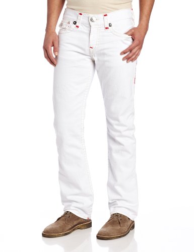 A classic straight leg jean features a traditional five pocket construction with stylish details on white denim in our ricky naturalize super t jean with red barracks and matching red back label
